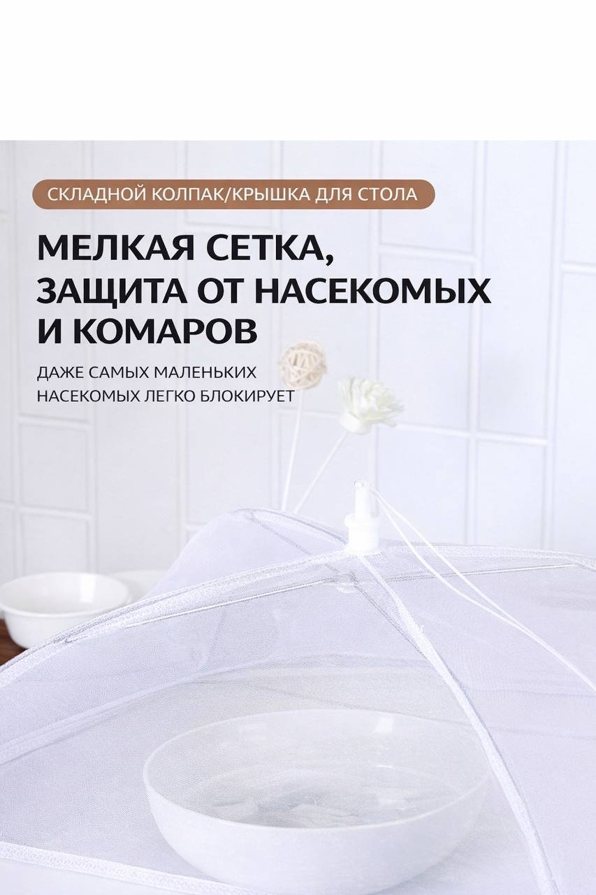 Практичный кухонный аксессуар, который защищает еду от мух, насекомых и пыли. Лёгкая дышащая сетка накрывает блюда, сохраняя свежесть продуктов и чистоту на столе.