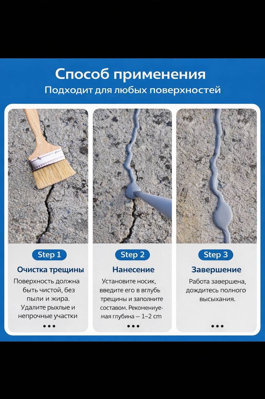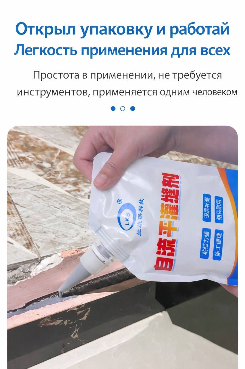 Средство самостоятельно выравнивается после нанесения, обеспечивая аккуратный результат без сложных инструментов. Подходит для ремонта дома, на улице, в гараже, на балконе или фасаде.