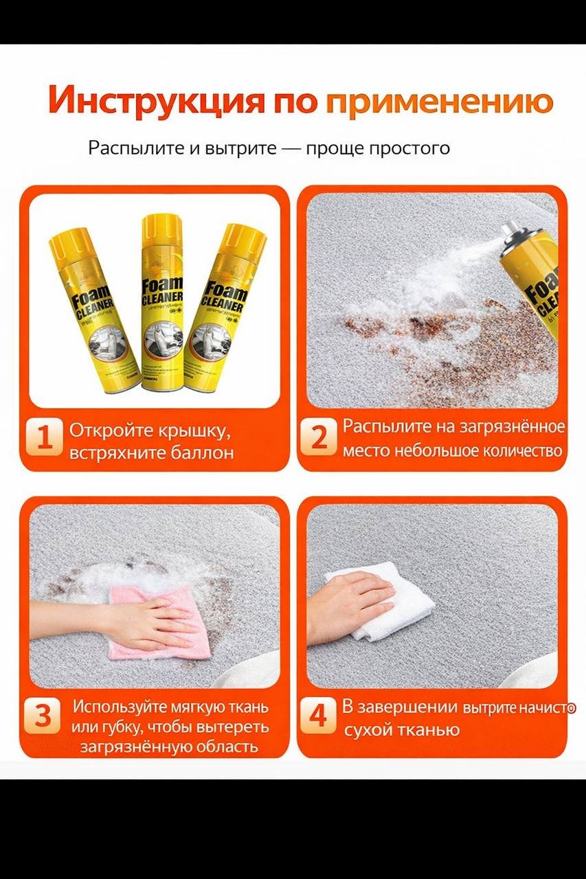 Средство образует густую активную пену, которая мягко очищает поверхность, не повреждая материал. Подходит для очистки мебели, автомобильных сидений, кухонных поверхностей, бытовой техники и других предметов.