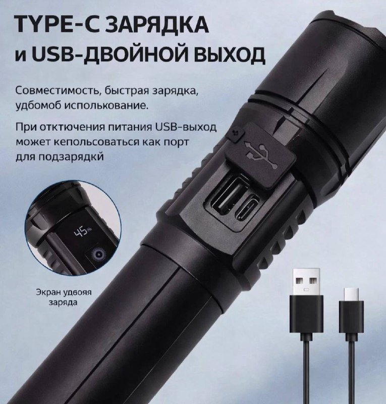 Фонарь оснащён аккумулятором большой ёмкости, который обеспечивает длительную автономную работу. Благодаря разъёму Type-C устройство быстро заряжается, а USB-выход позволяет использовать фонарик как Power Bank для подзарядки телефона или других устройств.